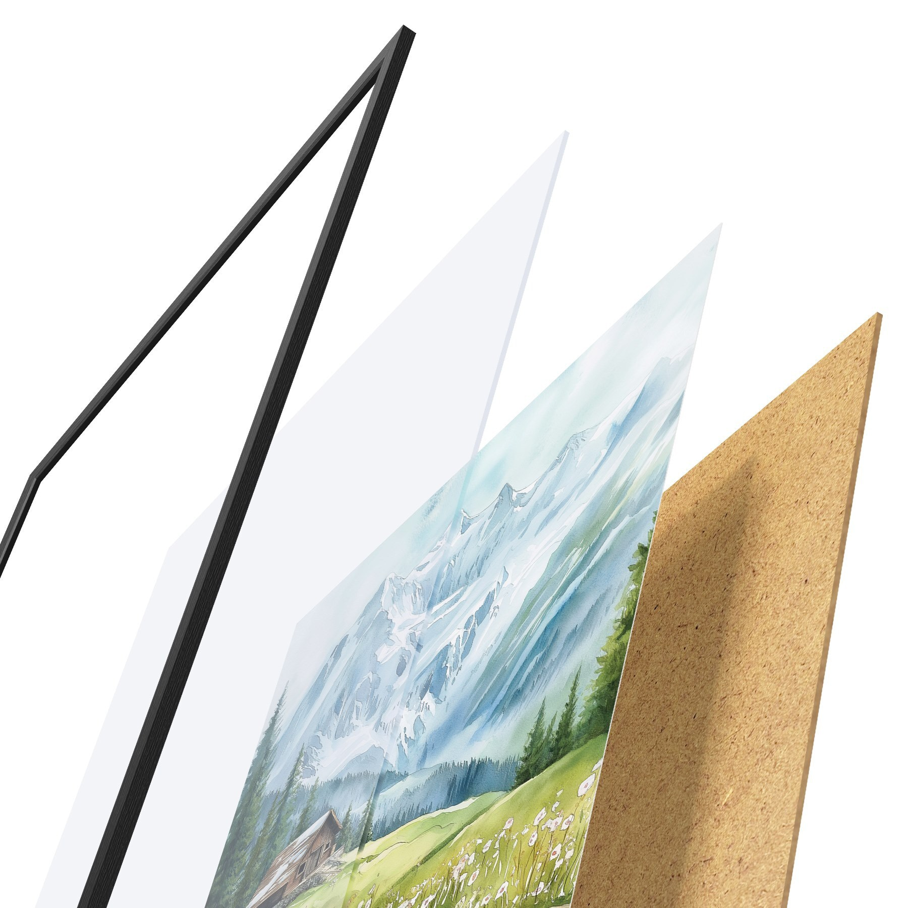 El póster consta de marco, plexiglás, imagen impresa y soporte de aglomerado. El póster puede colgarse inmediatamente en la pared gracias a los soportes de la parte posterior.