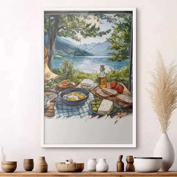 Poster Estética de camping, estilo acuarela, lago de verano, naturaleza, comida Nr f42428