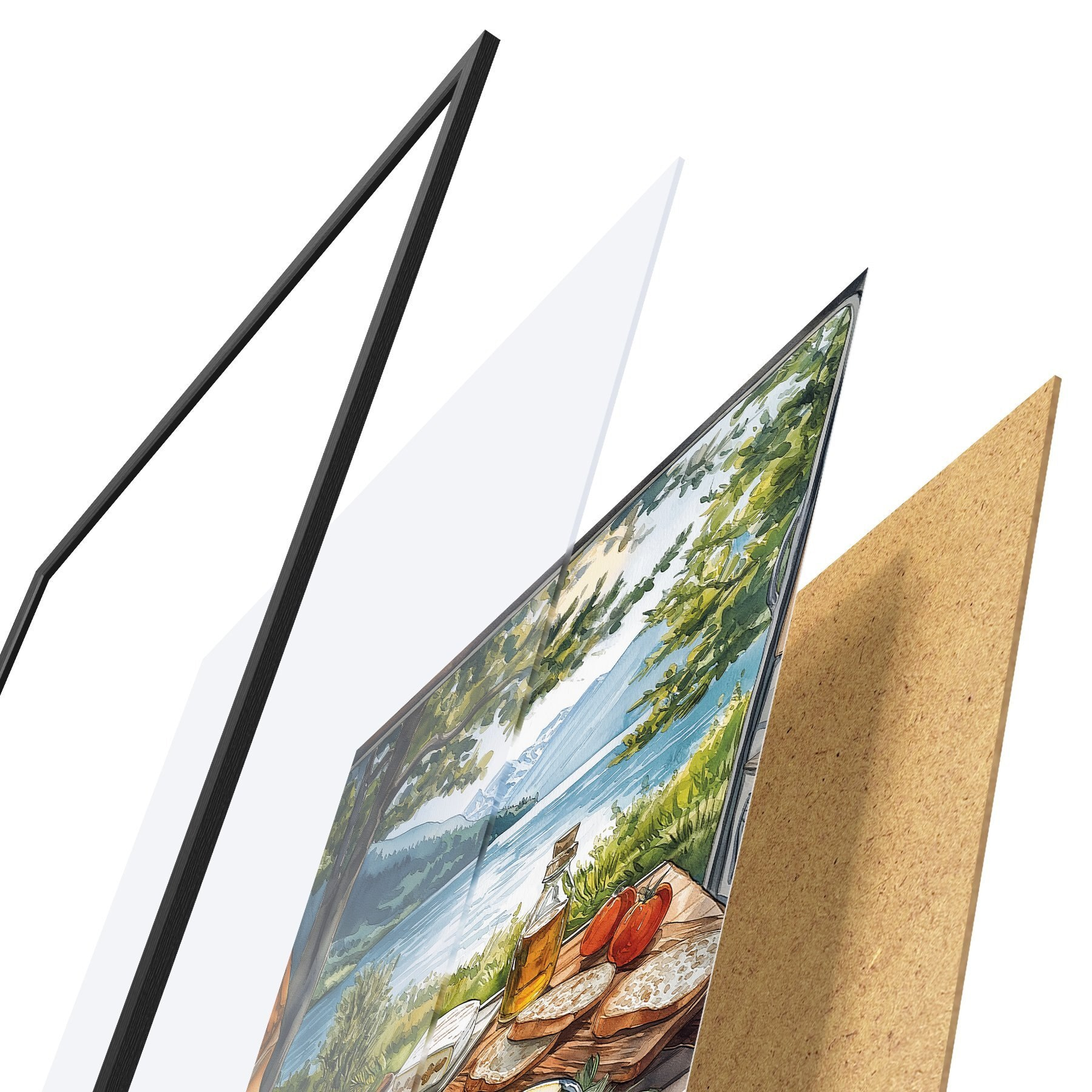 Poster Estética de camping, estilo acuarela, lago de verano, naturaleza, comida f42428