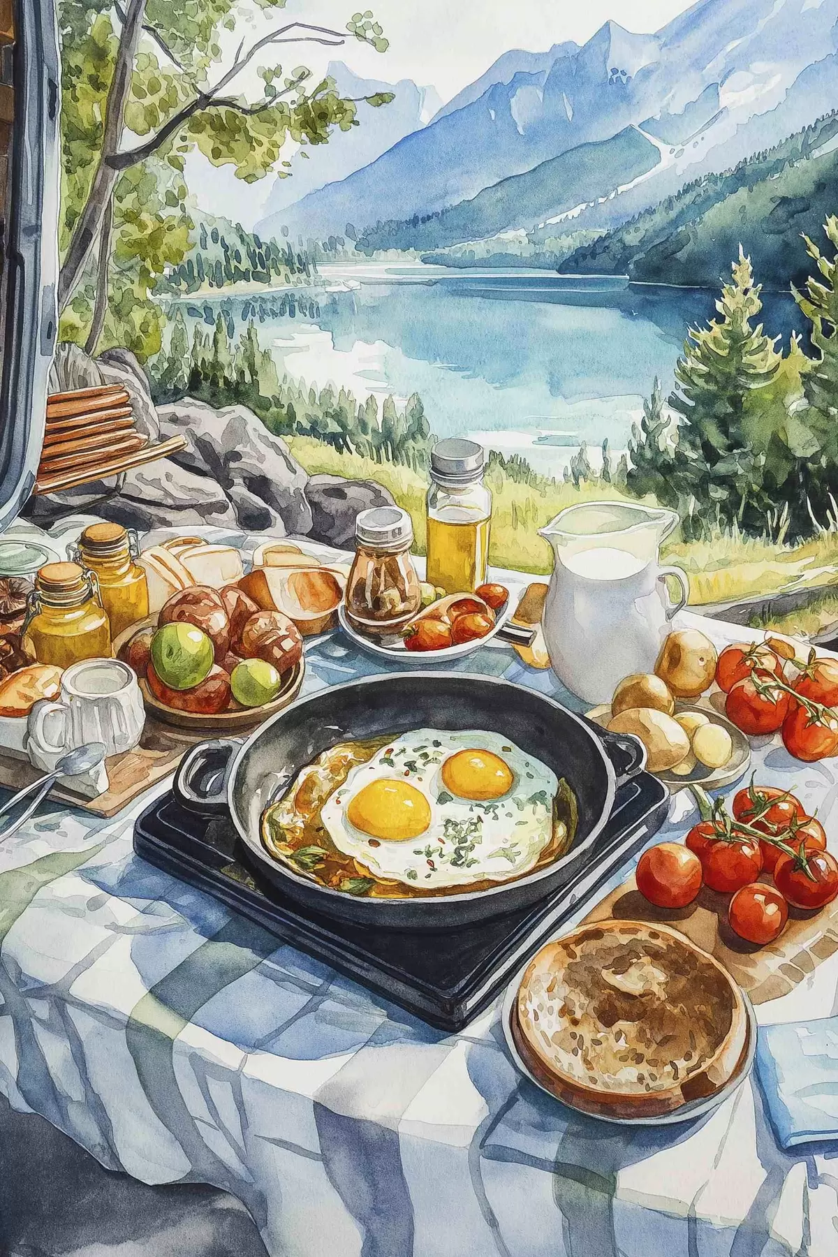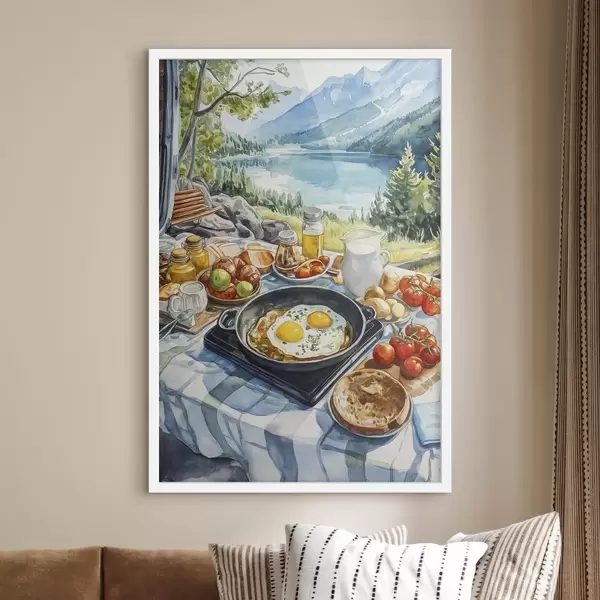 Poster Estético desayuno cerca del lago, estilo acuarela f42432