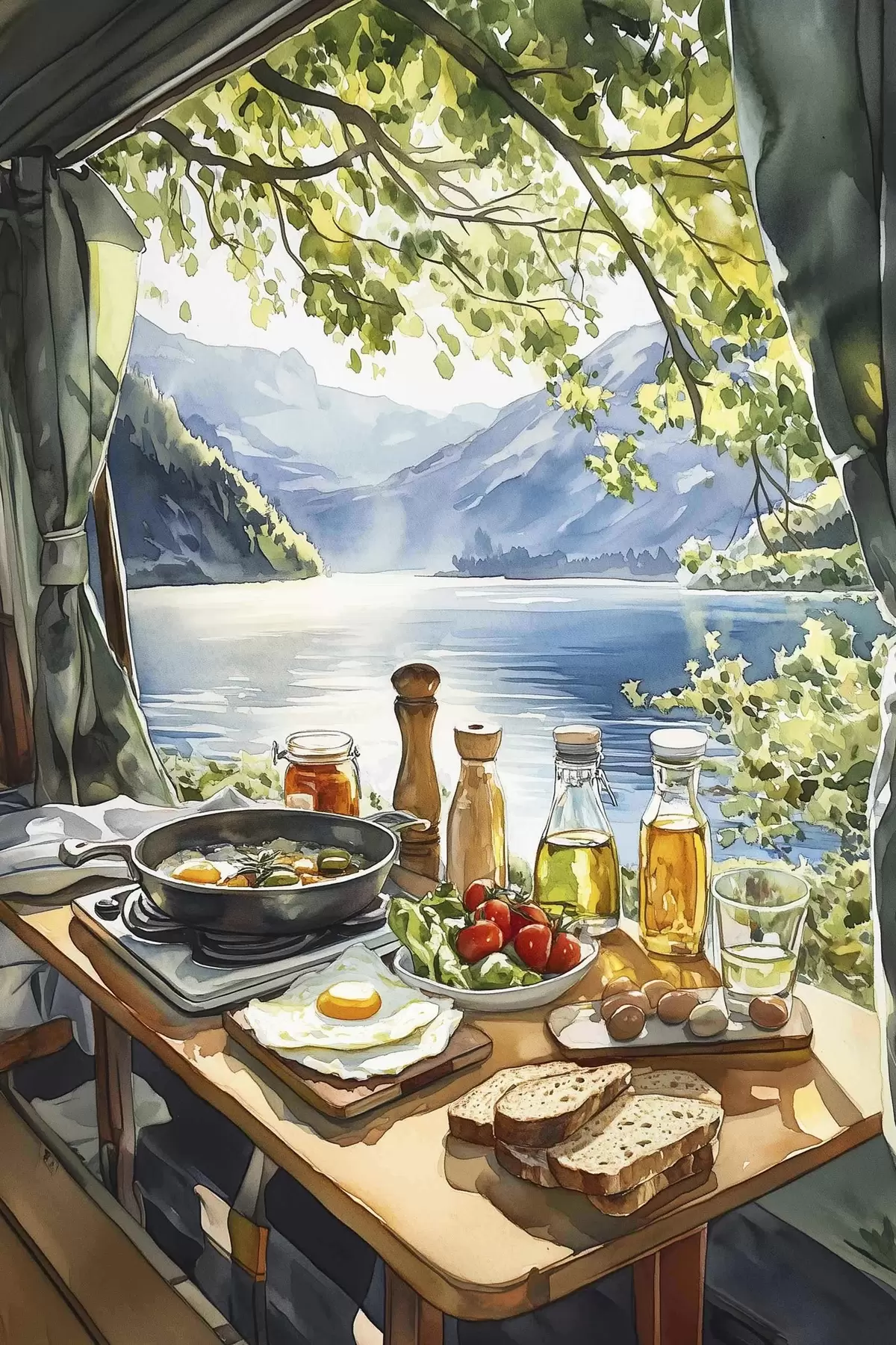 Poster Hermosa mañana de verano, lago, estilo acuarela, desayuno, viajar f42433