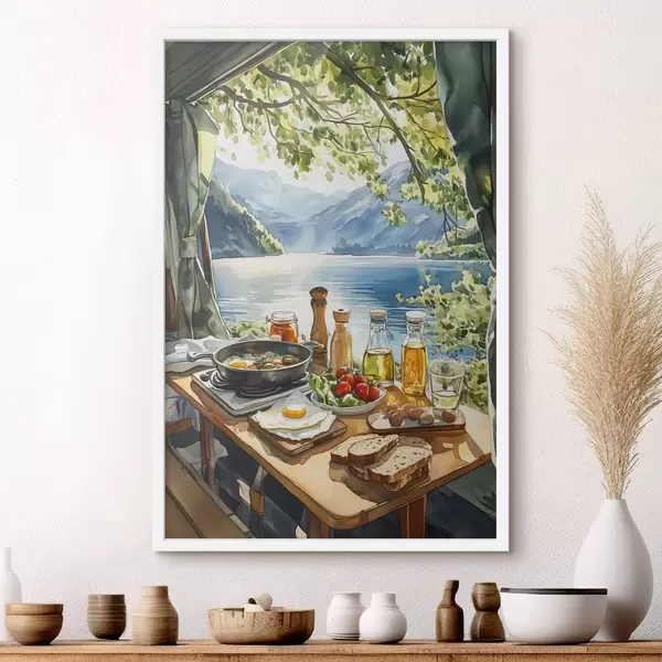 Poster Hermosa mañana de verano, lago, estilo acuarela, desayuno, viajar Nr f42433