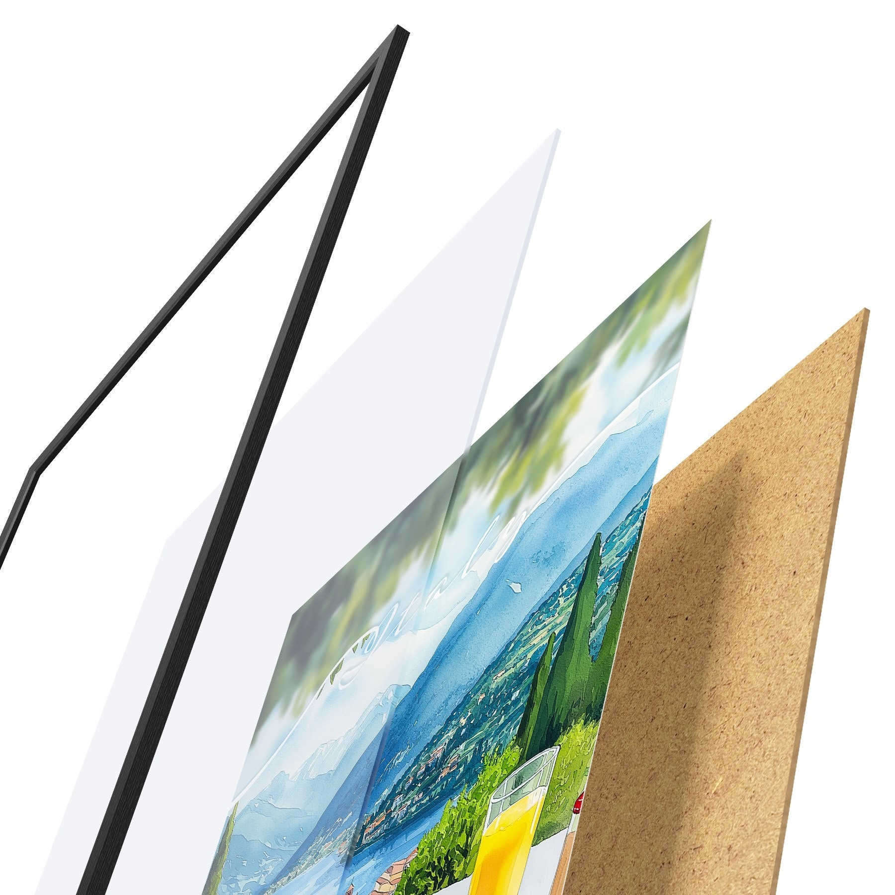 El póster consta de marco, plexiglás, imagen impresa y soporte de aglomerado. El póster puede colgarse inmediatamente en la pared gracias a los soportes de la parte posterior.