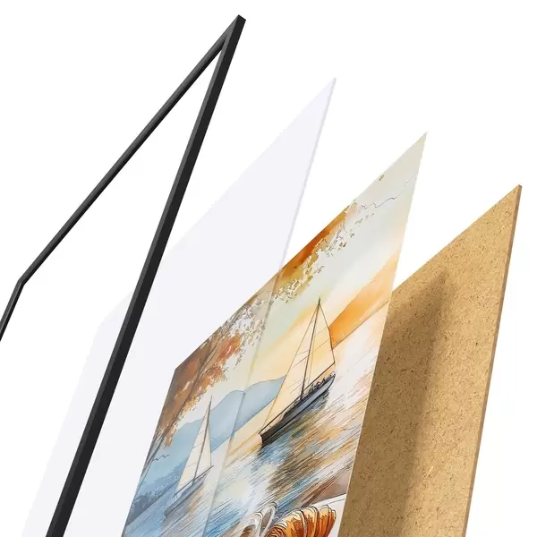 El póster consta de marco, plexiglás, imagen impresa y soporte de aglomerado. El póster puede colgarse inmediatamente en la pared gracias a los soportes de la parte posterior.