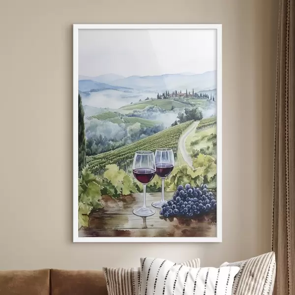 Poster Paisaje toscano, patios de uvas, copas de vino, estilo acuarela Nr f42445