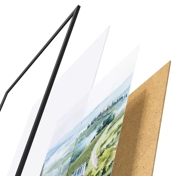 El póster consta de marco, plexiglás, imagen impresa y soporte de aglomerado. El póster puede colgarse inmediatamente en la pared gracias a los soportes de la parte posterior.