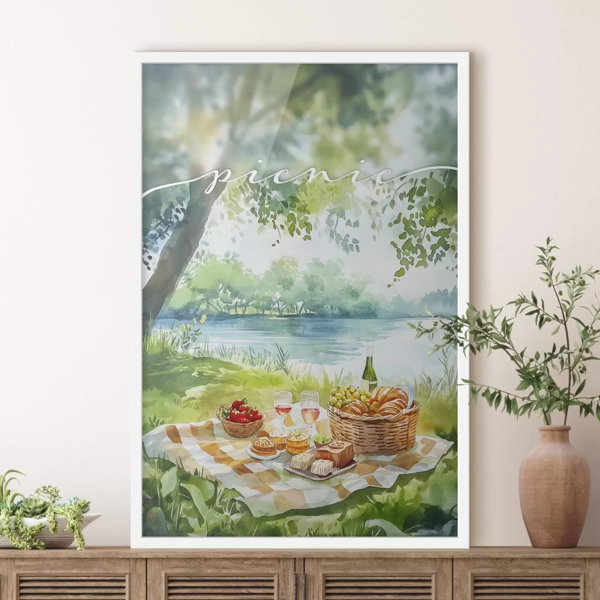 Poster Estética de picnic, naturaleza de verano, lago, romántico, estilo acuarela Nr f42450