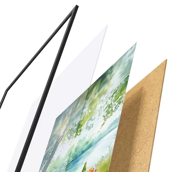 El póster consta de marco, plexiglás, imagen impresa y soporte de aglomerado. El póster puede colgarse inmediatamente en la pared gracias a los soportes de la parte posterior.