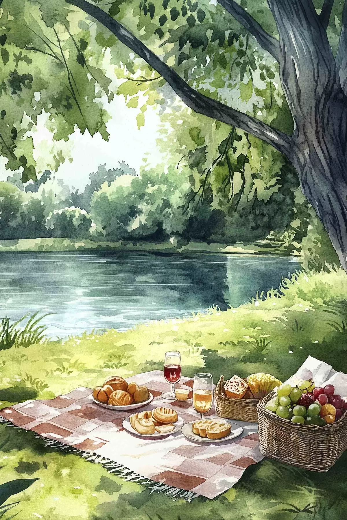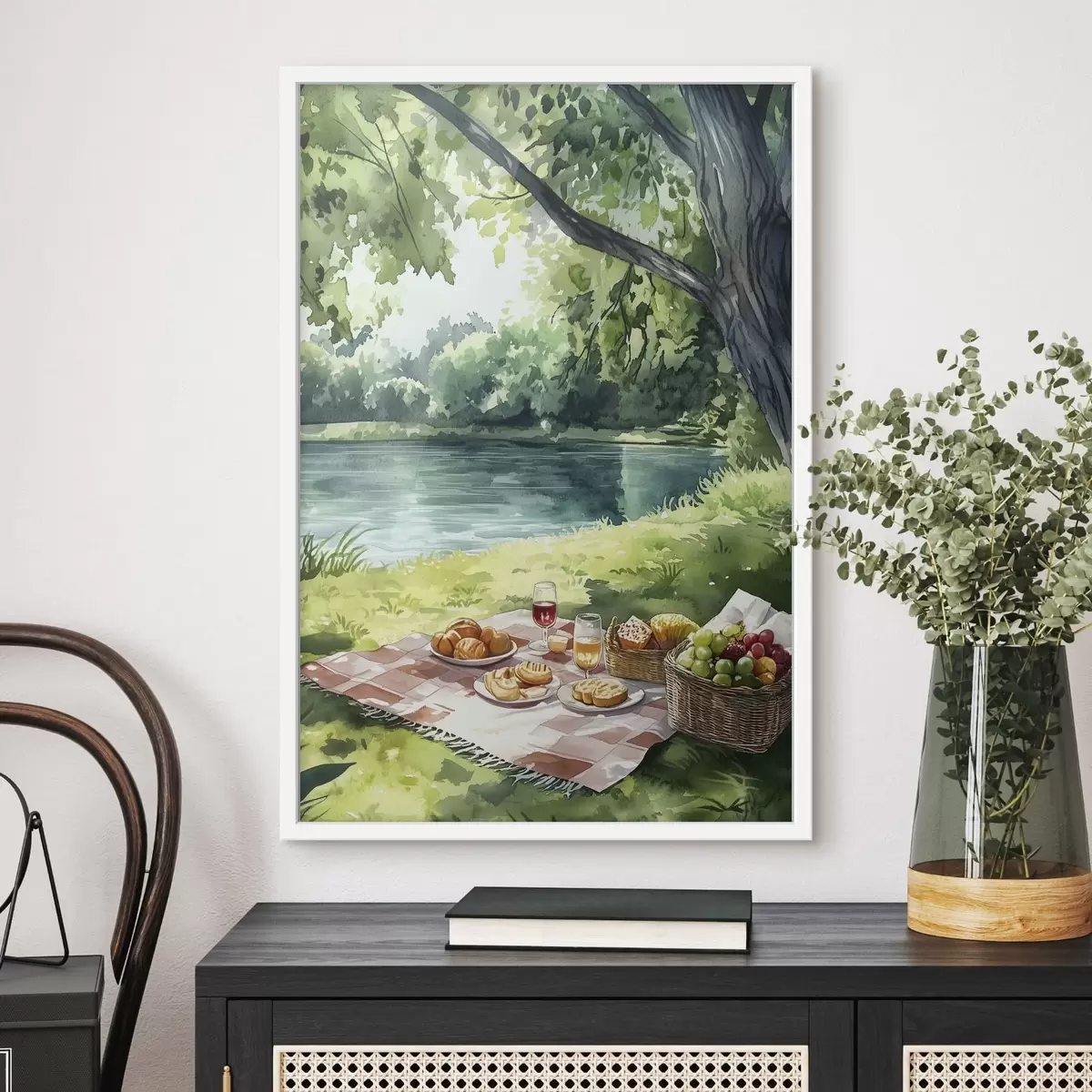 Poster Hermoso picnic romántico por el lago de verano, frutas, vegetación Nr f42451