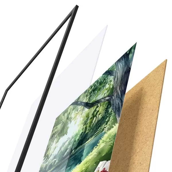 El póster consta de marco, plexiglás, imagen impresa y soporte de aglomerado. El póster puede colgarse inmediatamente en la pared gracias a los soportes de la parte posterior.