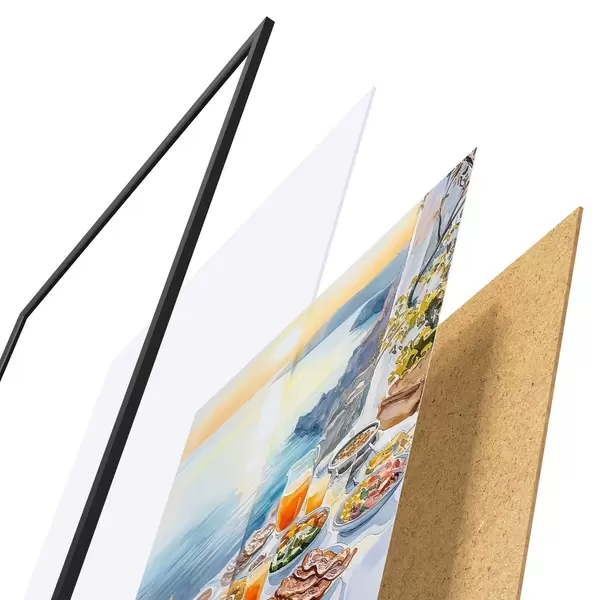 El póster consta de marco, plexiglás, imagen impresa y soporte de aglomerado. El póster puede colgarse inmediatamente en la pared gracias a los soportes de la parte posterior.