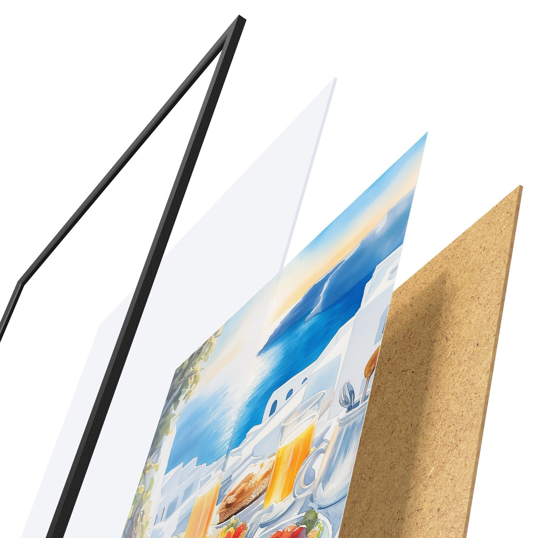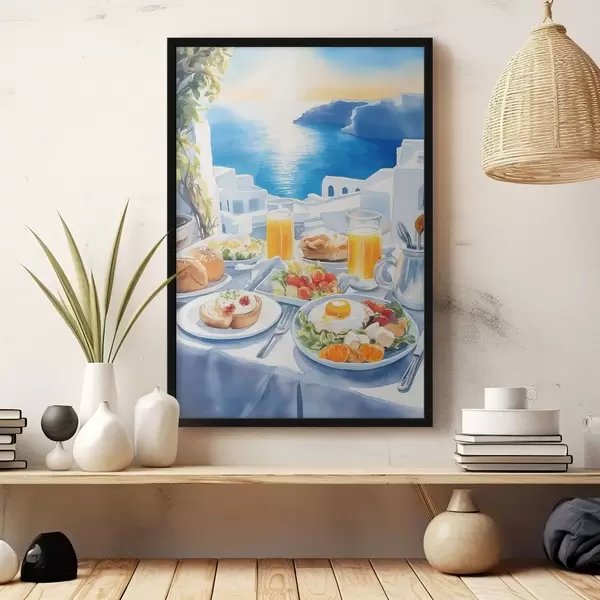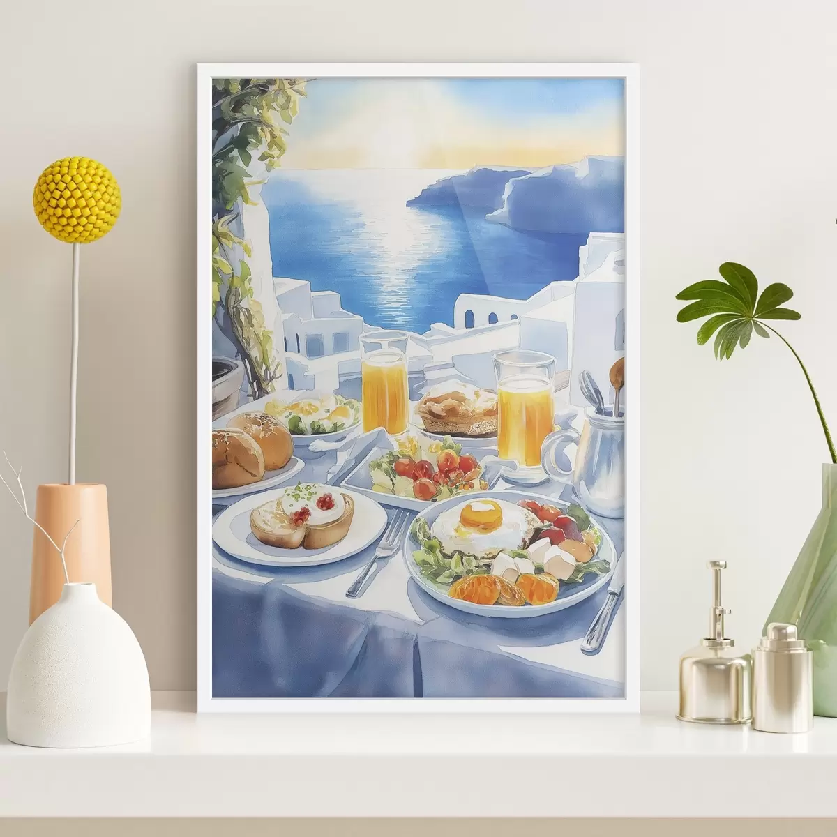 Poster Paisajes de Santorini, desayuno, estilo acuarela, casco antiguo Nr f42454