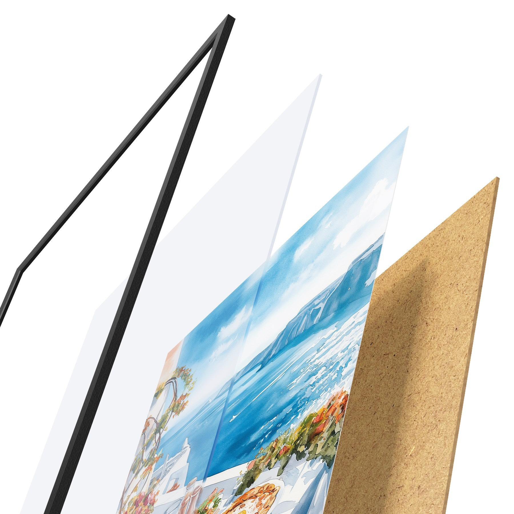El póster consta de marco, plexiglás, imagen impresa y soporte de aglomerado. El póster puede colgarse inmediatamente en la pared gracias a los soportes de la parte posterior.