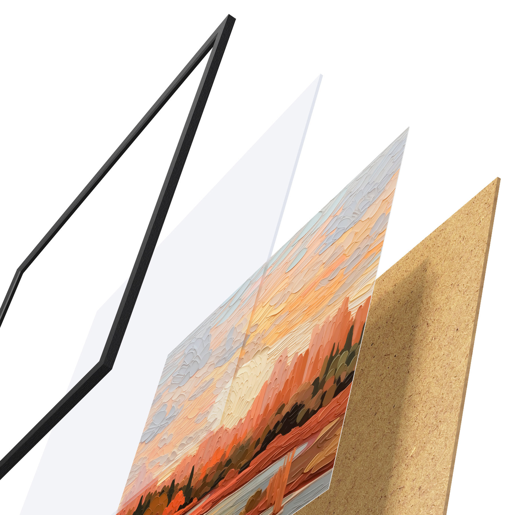 El póster consta de marco, plexiglás, imagen impresa y soporte de aglomerado. El póster puede colgarse inmediatamente en la pared gracias a los soportes de la parte posterior.