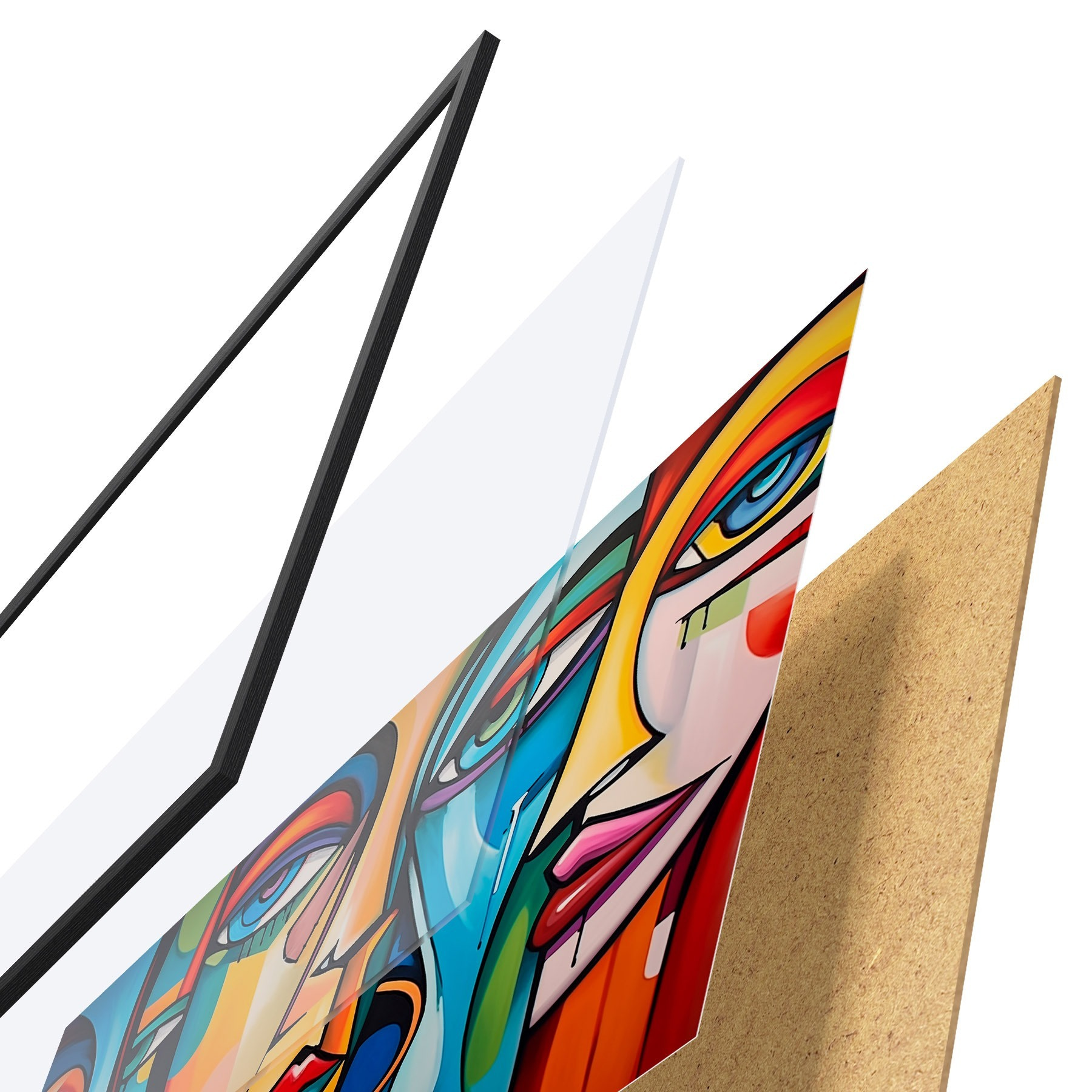 El póster consta de marco, plexiglás, imagen impresa y soporte de aglomerado. El póster puede colgarse inmediatamente en la pared gracias a los soportes de la parte posterior.