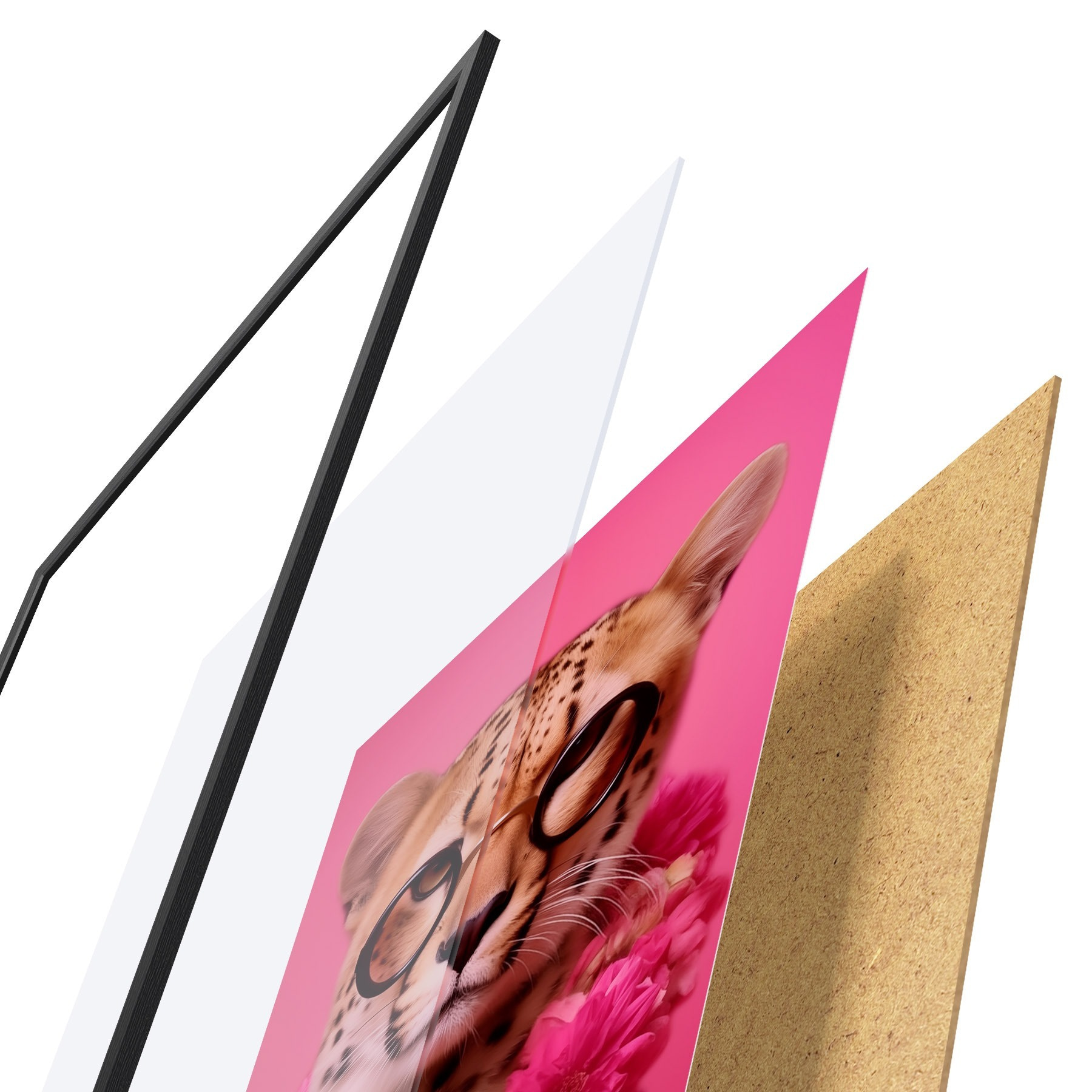 El póster consta de marco, plexiglás, imagen impresa y soporte de aglomerado. El póster puede colgarse inmediatamente en la pared gracias a los soportes de la parte posterior.