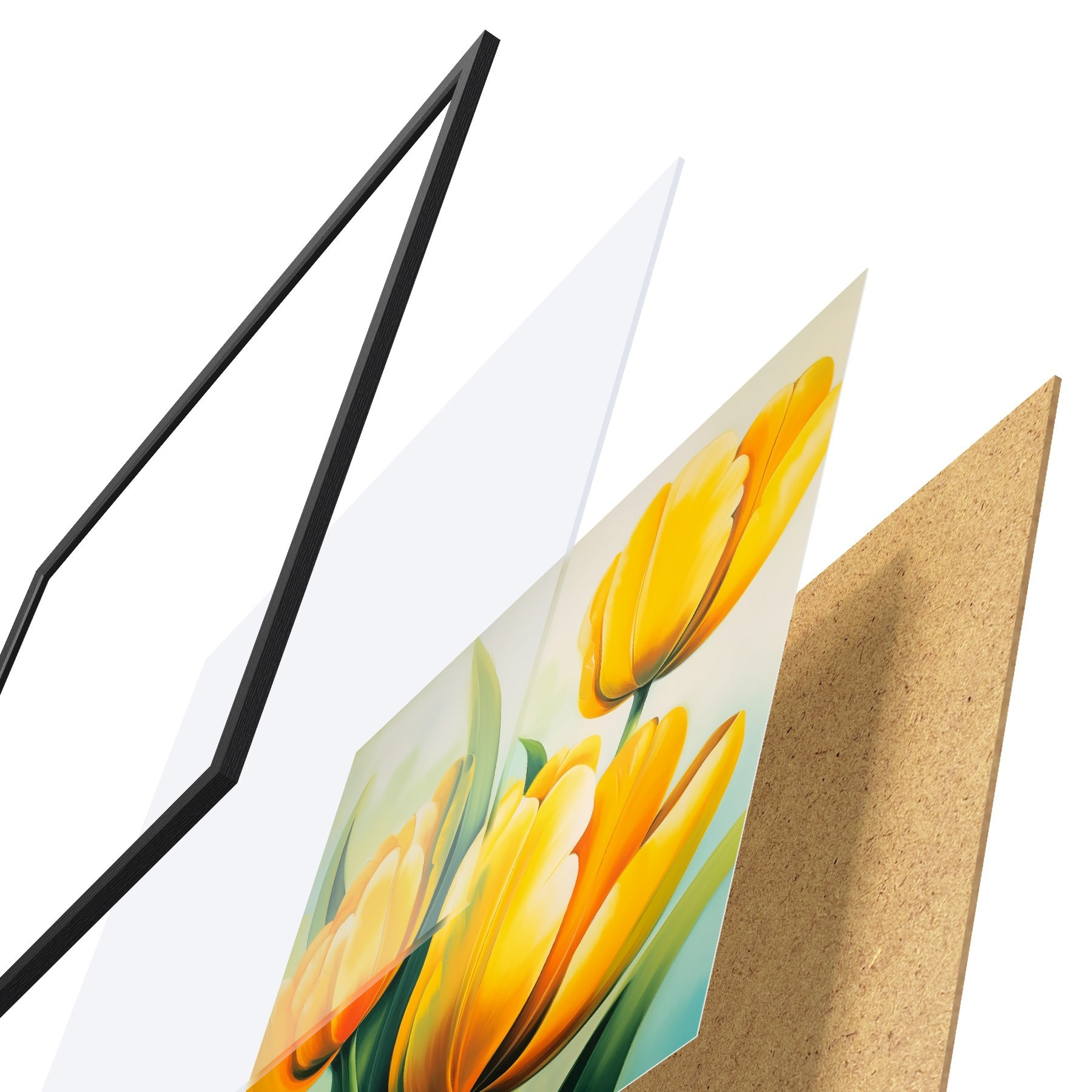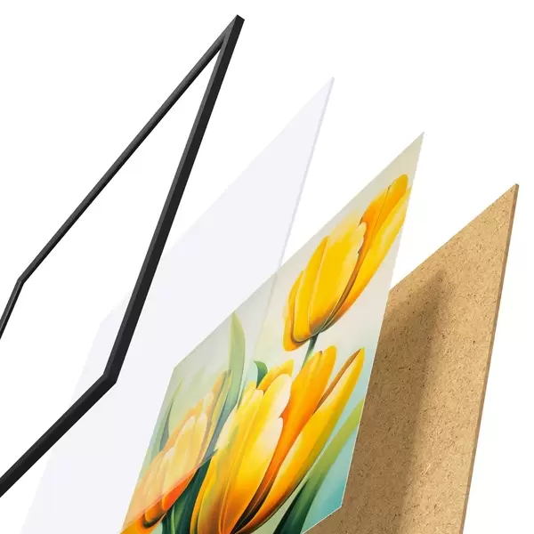 El póster consta de marco, plexiglás, imagen impresa y soporte de aglomerado. El póster puede colgarse inmediatamente en la pared gracias a los soportes de la parte posterior.