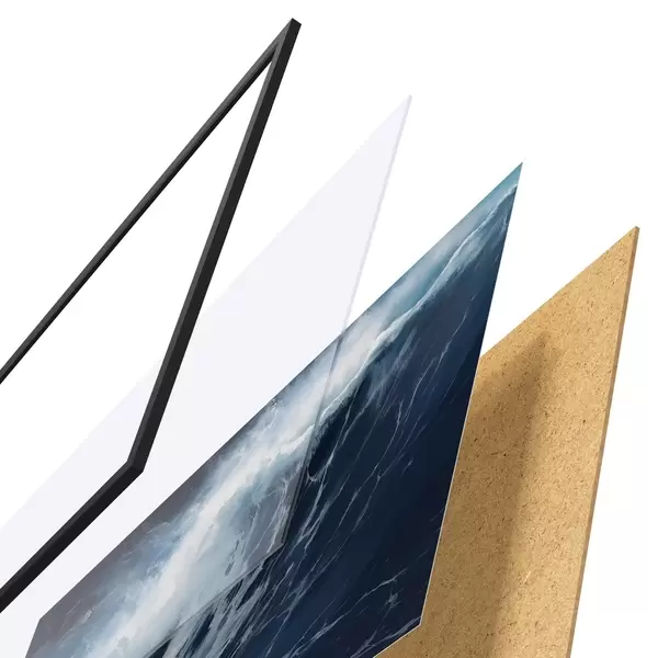 El póster consta de marco, plexiglás, imagen impresa y soporte de aglomerado. El póster puede colgarse inmediatamente en la pared gracias a los soportes de la parte posterior.