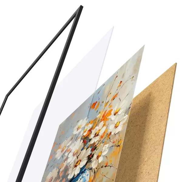 El póster consta de marco, plexiglás, imagen impresa y soporte de aglomerado. El póster puede colgarse inmediatamente en la pared gracias a los soportes de la parte posterior.
