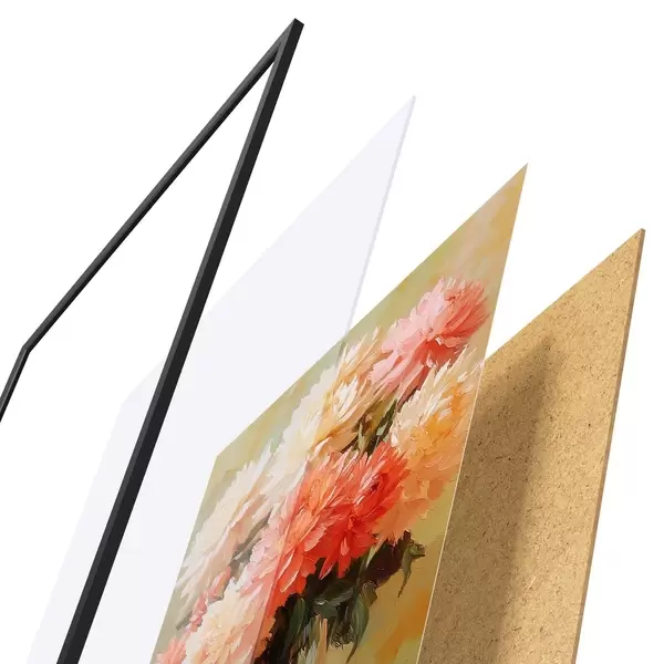 El póster consta de marco, plexiglás, imagen impresa y soporte de aglomerado. El póster puede colgarse inmediatamente en la pared gracias a los soportes de la parte posterior.