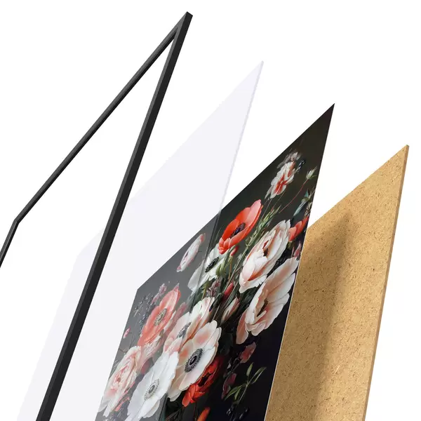 El póster consta de marco, plexiglás, imagen impresa y soporte de aglomerado. El póster puede colgarse inmediatamente en la pared gracias a los soportes de la parte posterior.