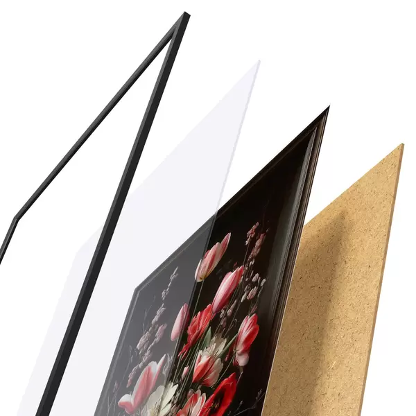 El póster consta de marco, plexiglás, imagen impresa y soporte de aglomerado. El póster puede colgarse inmediatamente en la pared gracias a los soportes de la parte posterior.
