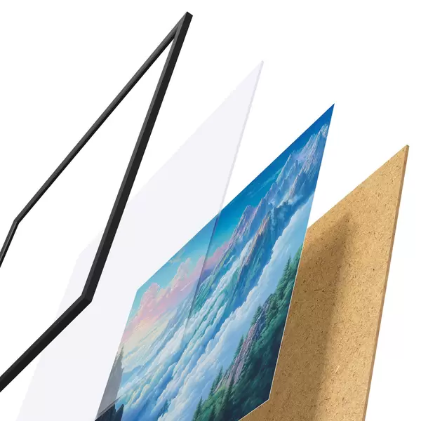 El póster consta de marco, plexiglás, imagen impresa y soporte de aglomerado. El póster puede colgarse inmediatamente en la pared gracias a los soportes de la parte posterior.