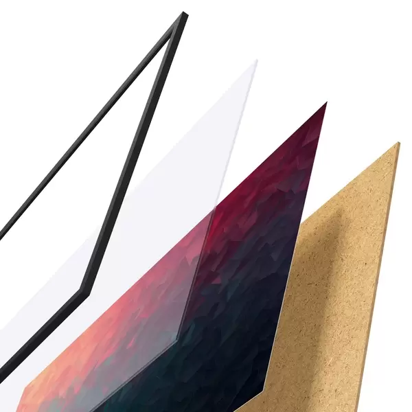 El póster consta de marco, plexiglás, imagen impresa y soporte de aglomerado. El póster puede colgarse inmediatamente en la pared gracias a los soportes de la parte posterior.