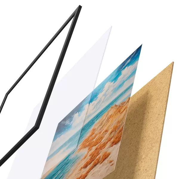 El póster consta de marco, plexiglás, imagen impresa y soporte de aglomerado. El póster puede colgarse inmediatamente en la pared gracias a los soportes de la parte posterior.