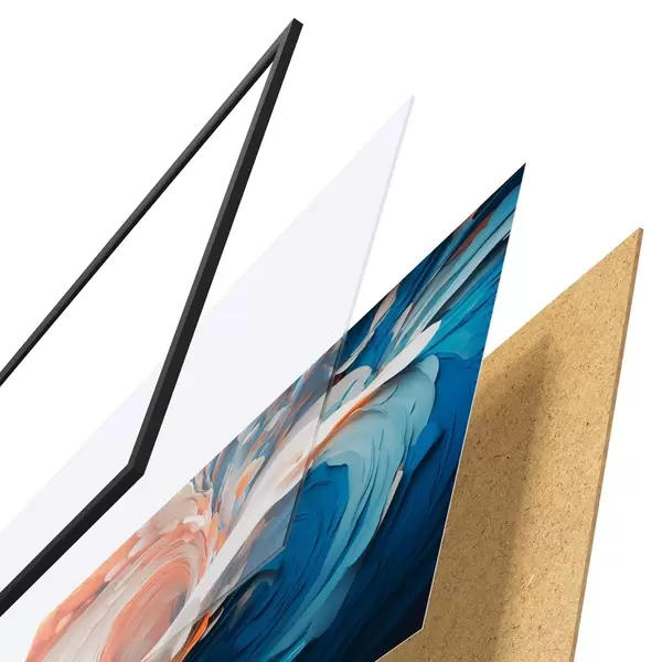 El póster consta de marco, plexiglás, imagen impresa y soporte de aglomerado. El póster puede colgarse inmediatamente en la pared gracias a los soportes de la parte posterior.