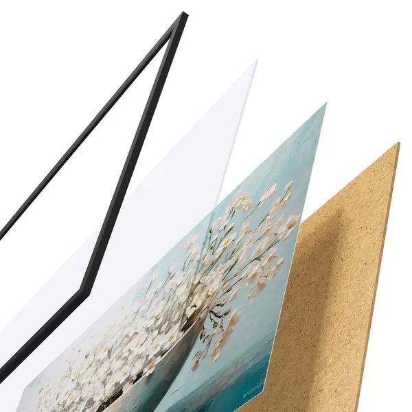 El póster consta de marco, plexiglás, imagen impresa y soporte de aglomerado. El póster puede colgarse inmediatamente en la pared gracias a los soportes de la parte posterior.