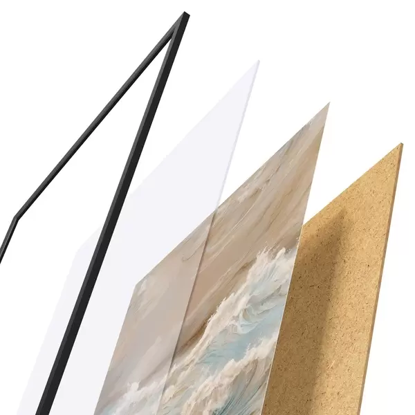 El póster consta de marco, plexiglás, imagen impresa y soporte de aglomerado. El póster puede colgarse inmediatamente en la pared gracias a los soportes de la parte posterior.