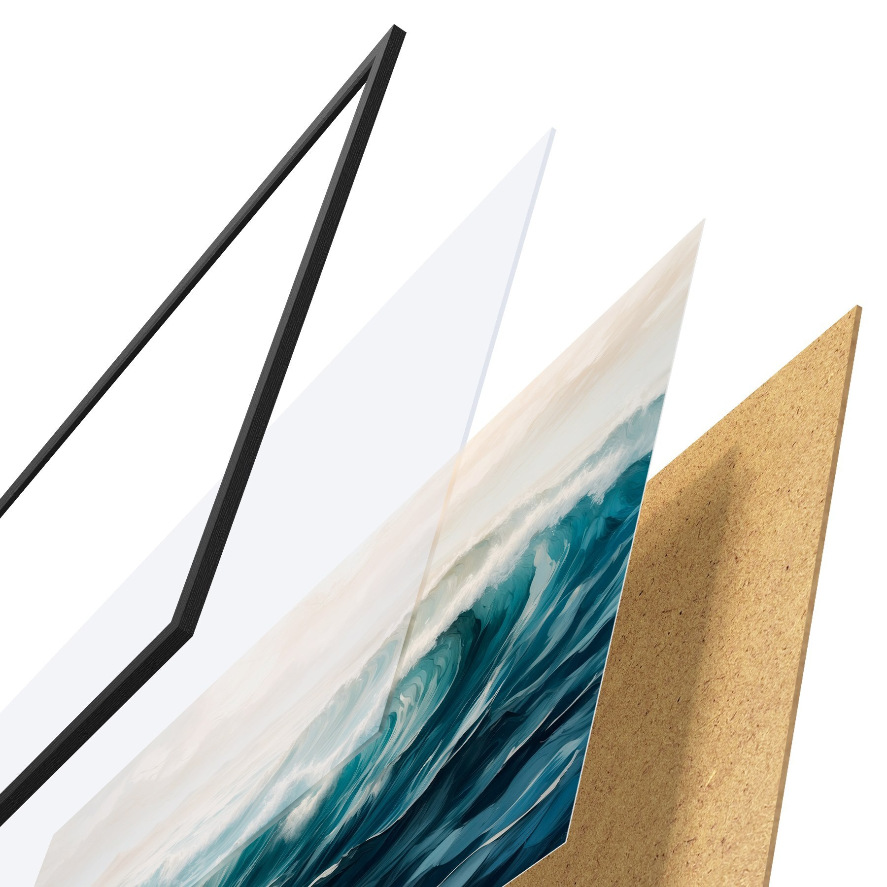 El póster consta de marco, plexiglás, imagen impresa y soporte de aglomerado. El póster puede colgarse inmediatamente en la pared gracias a los soportes de la parte posterior.
