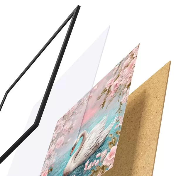 El póster consta de marco, plexiglás, imagen impresa y soporte de aglomerado. El póster puede colgarse inmediatamente en la pared gracias a los soportes de la parte posterior.