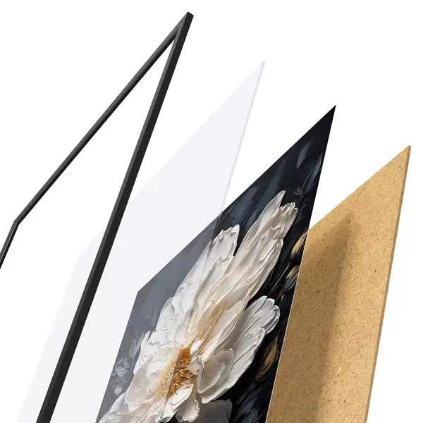 El póster consta de marco, plexiglás, imagen impresa y soporte de aglomerado. El póster puede colgarse inmediatamente en la pared gracias a los soportes de la parte posterior.