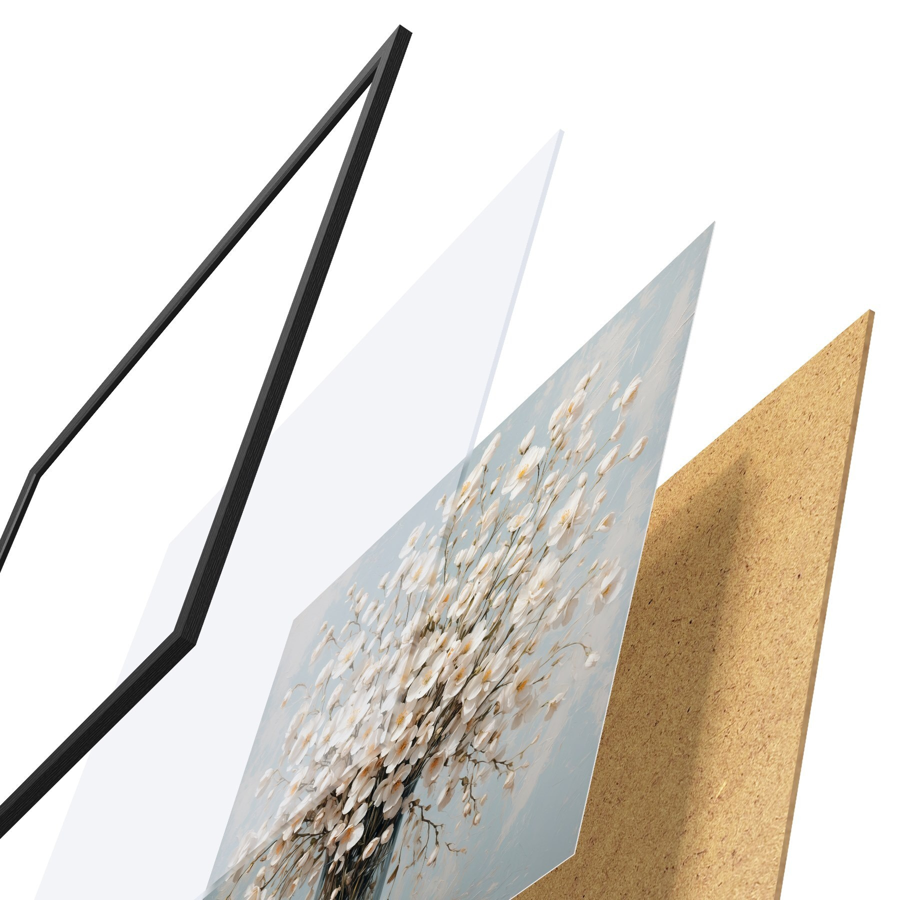 El póster consta de marco, plexiglás, imagen impresa y soporte de aglomerado. El póster puede colgarse inmediatamente en la pared gracias a los soportes de la parte posterior.