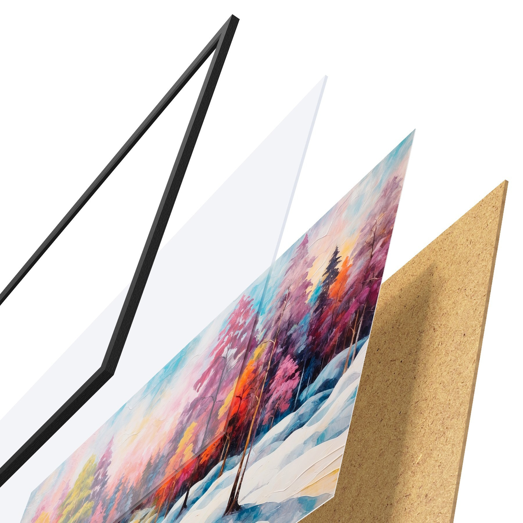 El póster consta de marco, plexiglás, imagen impresa y soporte de aglomerado. El póster puede colgarse inmediatamente en la pared gracias a los soportes de la parte posterior.