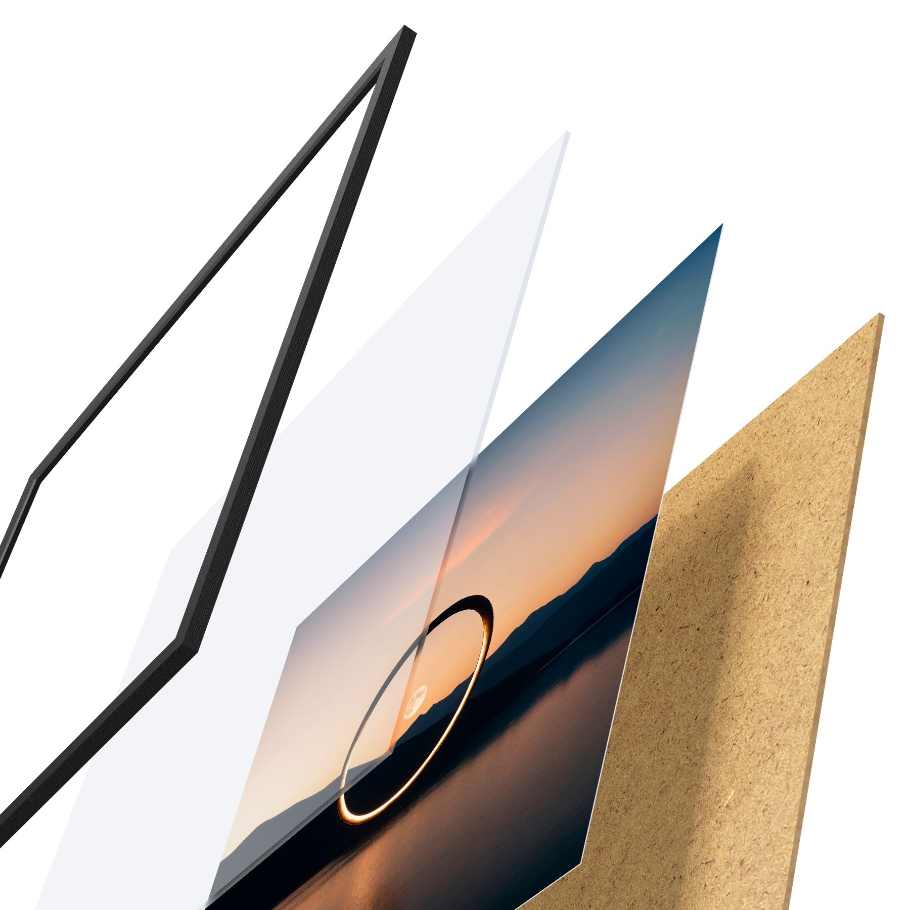 El póster consta de marco, plexiglás, imagen impresa y soporte de aglomerado. El póster puede colgarse inmediatamente en la pared gracias a los soportes de la parte posterior.