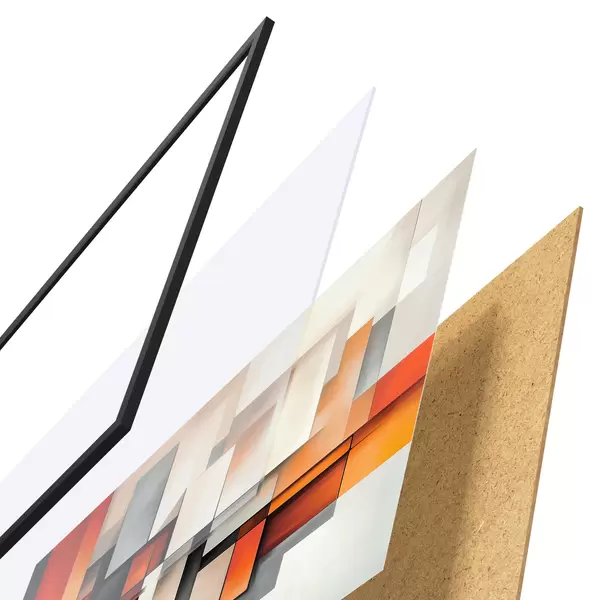 El póster consta de marco, plexiglás, imagen impresa y soporte de aglomerado. El póster puede colgarse inmediatamente en la pared gracias a los soportes de la parte posterior.