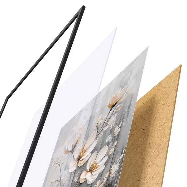 El póster consta de marco, plexiglás, imagen impresa y soporte de aglomerado. El póster puede colgarse inmediatamente en la pared gracias a los soportes de la parte posterior.
