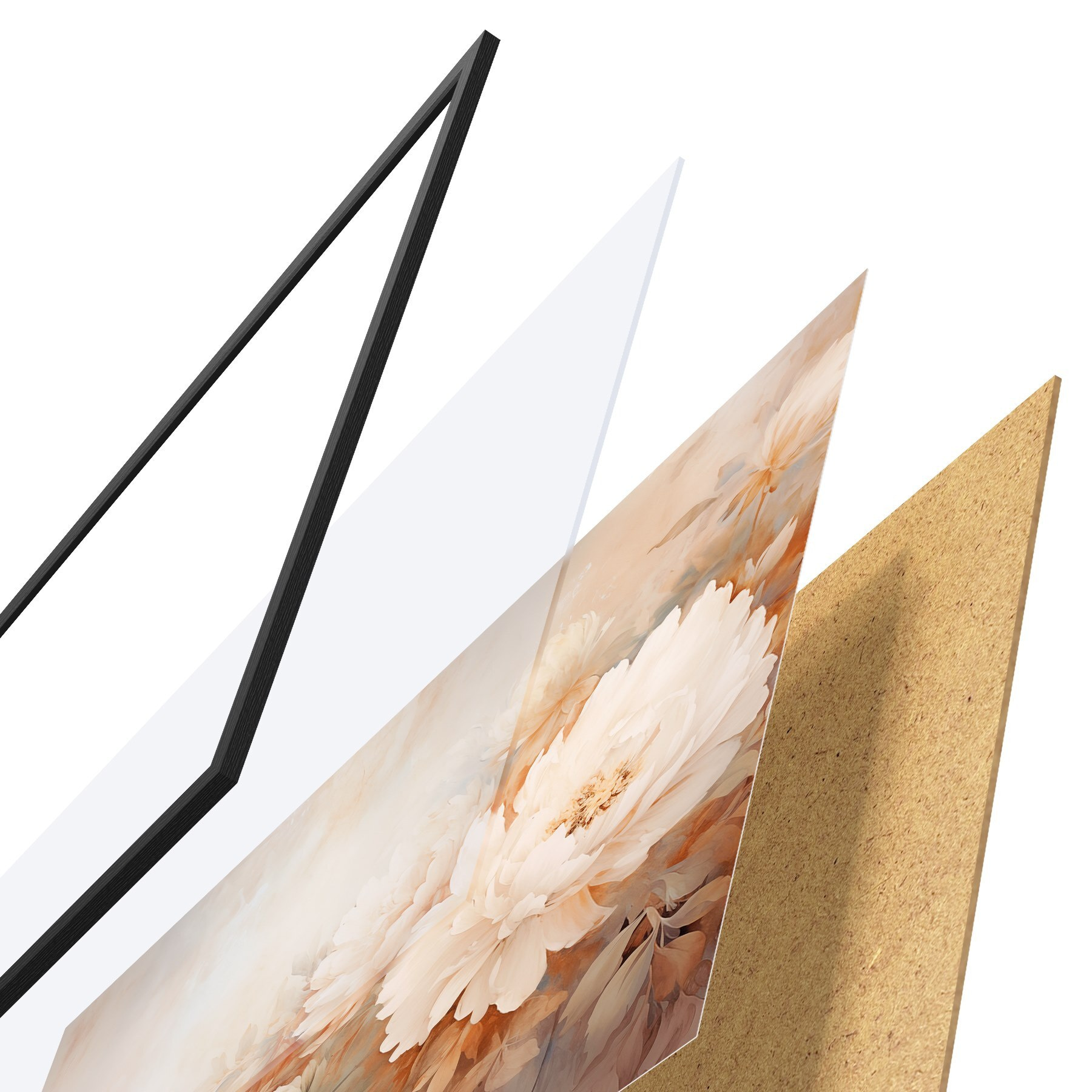 El póster consta de marco, plexiglás, imagen impresa y soporte de aglomerado. El póster puede colgarse inmediatamente en la pared gracias a los soportes de la parte posterior.