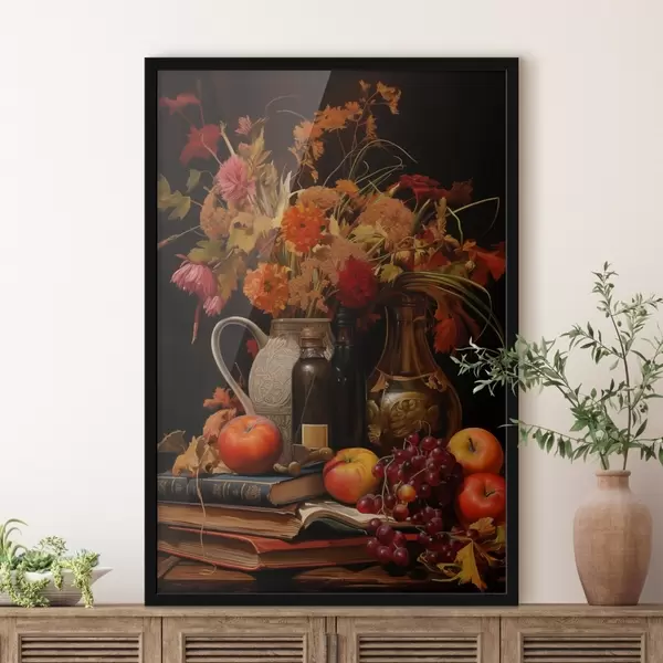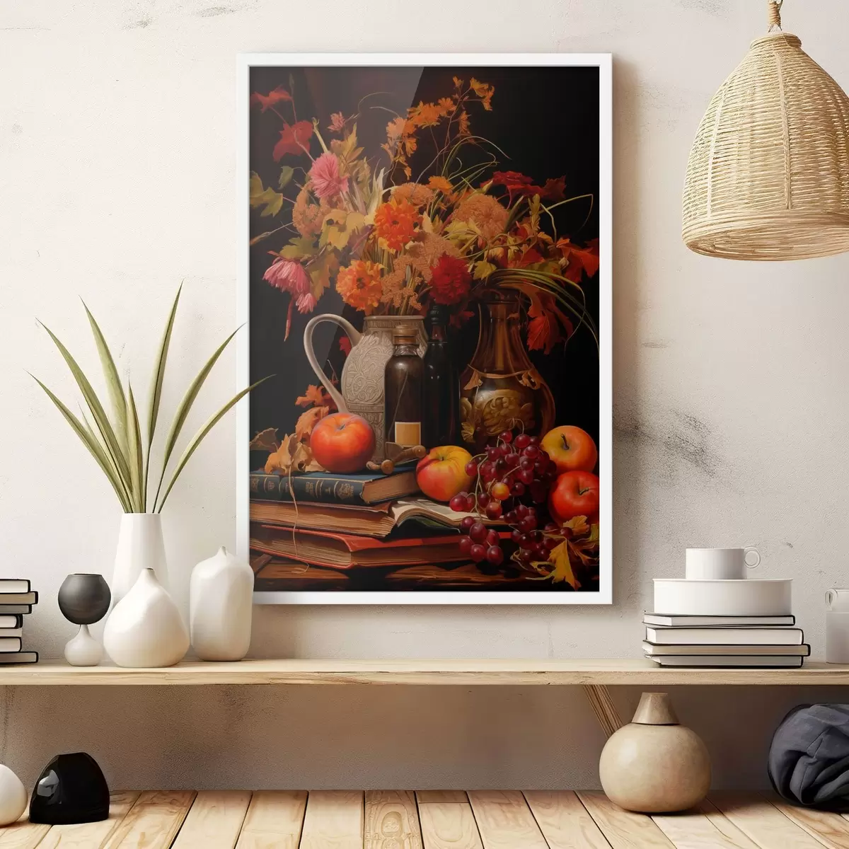 Poster Bodegón otoñal con un ramo de flores en cálidos tonos naranjas y rojos, manzanas, uvas, libros y platos de cerámica sobre fondo oscuro. f42561