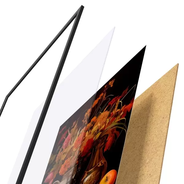 El póster consta de marco, plexiglás, imagen impresa y soporte de aglomerado. El póster puede colgarse inmediatamente en la pared gracias a los soportes de la parte posterior.
