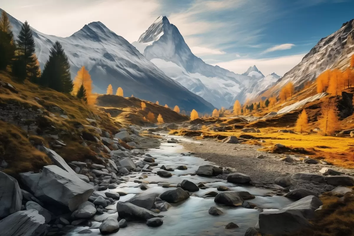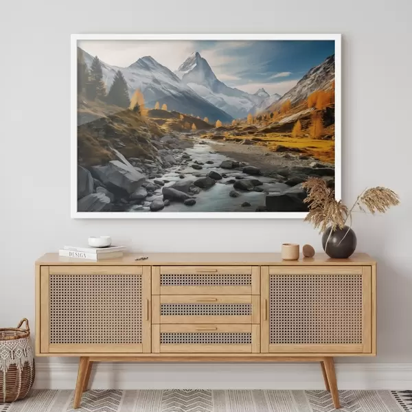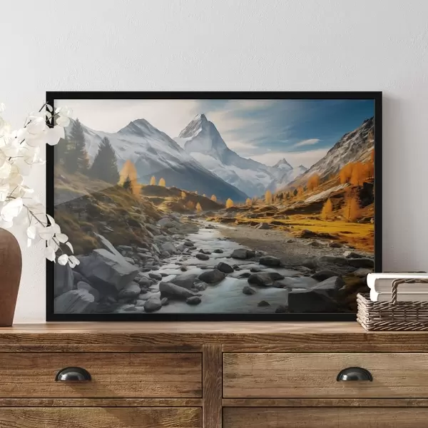 Poster Un paisaje otoñal de montaña con un río rápido, árboles dorados y un pico majestuoso contra un cielo brillante. f42564