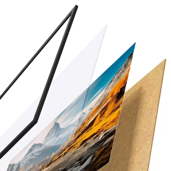 El póster consta de marco, plexiglás, imagen impresa y soporte de aglomerado. El póster puede colgarse inmediatamente en la pared gracias a los soportes de la parte posterior.
