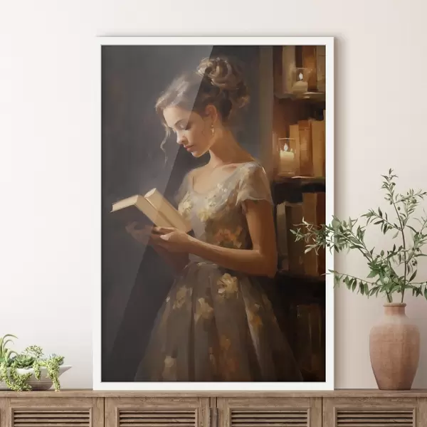 Poster Una mujer joven con un vestido elegante lee un libro en un ambiente iluminado, rodeada de estanterías y del suave resplandor de las velas. Nr f42570
