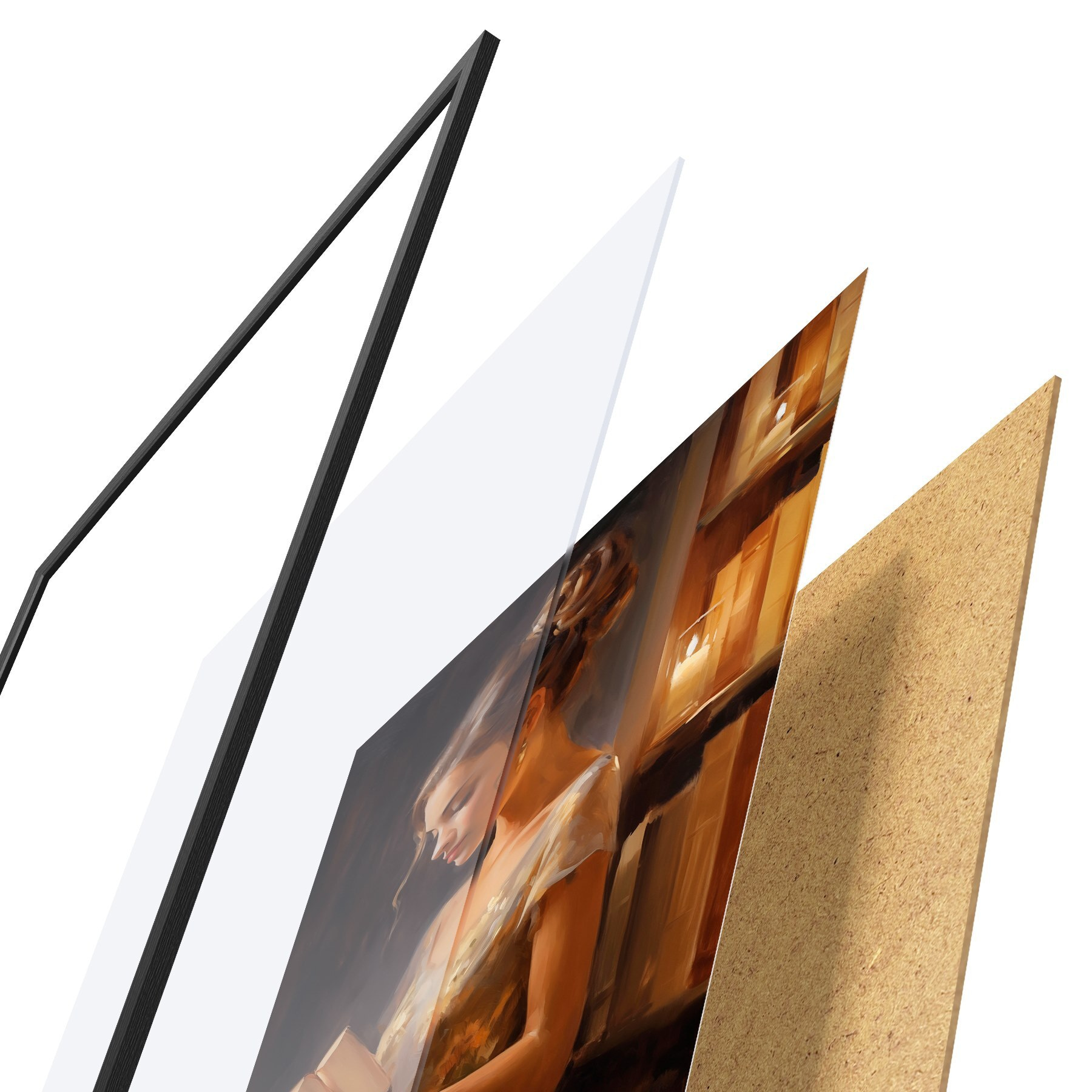 Poster Una mujer joven con un vestido elegante lee un libro en un ambiente iluminado, rodeada de estanterías y del suave resplandor de las velas. f42570