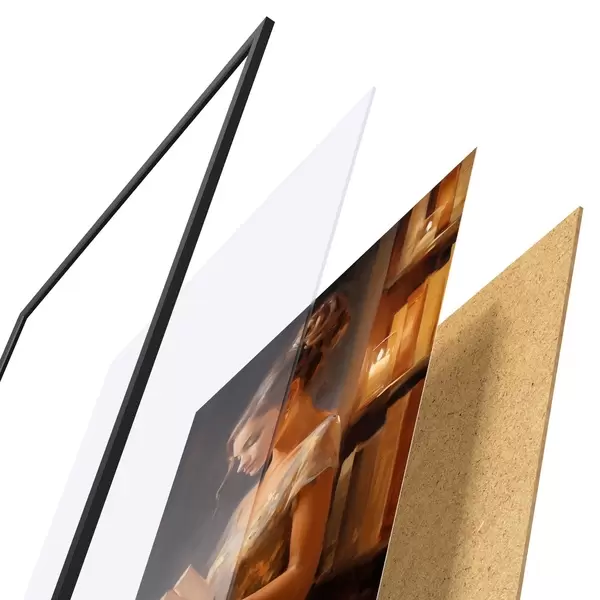 El póster consta de marco, plexiglás, imagen impresa y soporte de aglomerado. El póster puede colgarse inmediatamente en la pared gracias a los soportes de la parte posterior.
