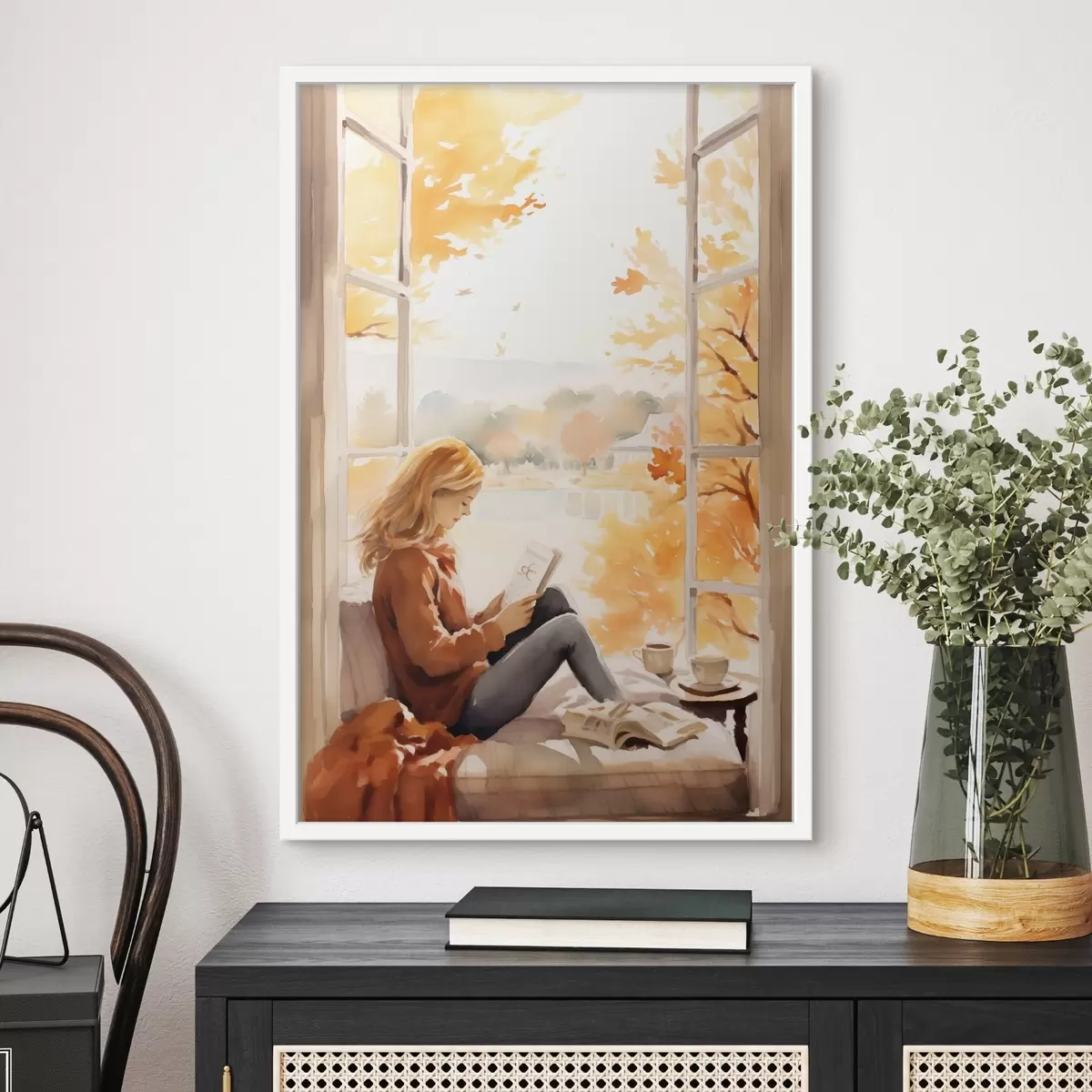 Poster Una chica lee un libro junto a una ventana abierta en un entorno otoñal, con árboles dorados y brillantes al fondo y una taza de té cerca. Nr f42572