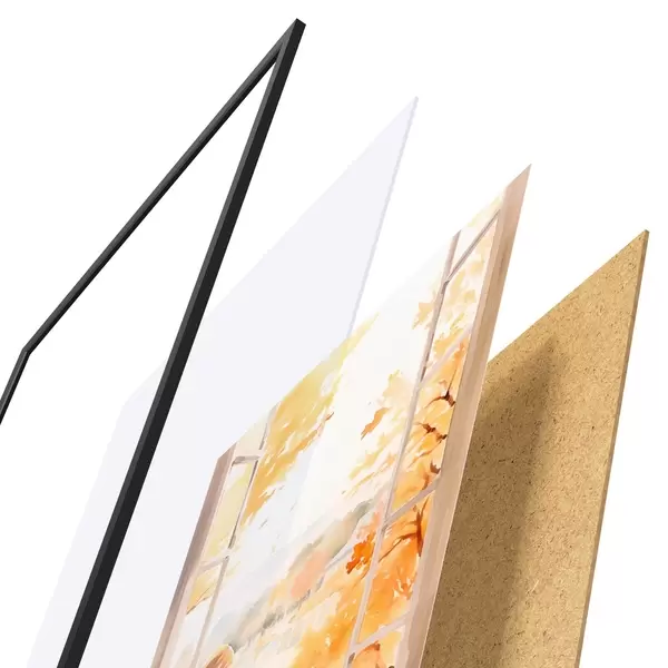 El póster consta de marco, plexiglás, imagen impresa y soporte de aglomerado. El póster puede colgarse inmediatamente en la pared gracias a los soportes de la parte posterior.